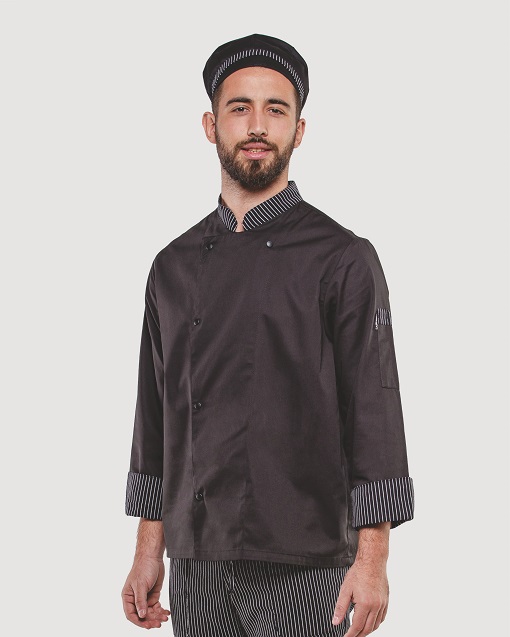 Σακάκι μάγειρα με ριγέ λεπτομέρειές στο λαιμό και στη μανσέτα. Κλείνει μπροστά με τρούκ. Μία τσέπη και θήκη για στυλό στο αριστερό μανίκι. Γιακάς τύπου ΜΑΟ. Αναδιπλούμενα μανίκια. Ελληνικό προϊόν.